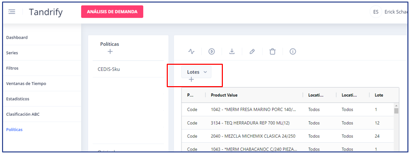 Los Lotes es el mínimo numero de piezas posible de pedir de acuerdo a su presentación o restricción fija por parte del proveedor. Es importante mantener actualizado el listado en caso de un cambio de presentación o una nueva restricción en cuanto a producto mínimo a pedir al proveedor. Para agregar un nuevo lote en la política deseada se selecciona el parámetro de Lotes y se da click en +.