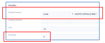 Para agregar un lote de un producto en específico, se selecciona el atributo del código y se selecciona el producto deseado. Posteriormente se indica en número de piezas por lote y se asigna una prioridad mayor como lo muestra el ejemplo del lado derecho.