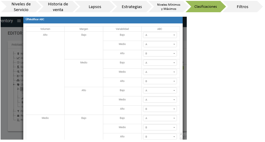 - La pantalla de Clasificaciones muestra los diferentes criterios utilizados para determinar la clasificación de cada producto: volumen, margen y variabilidad.