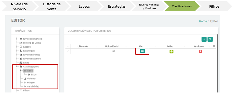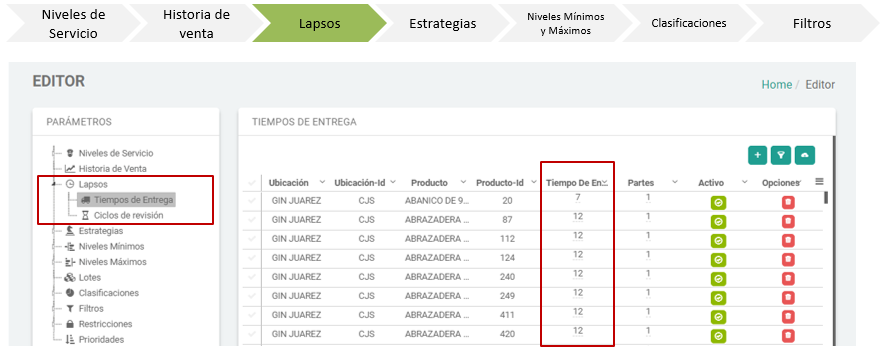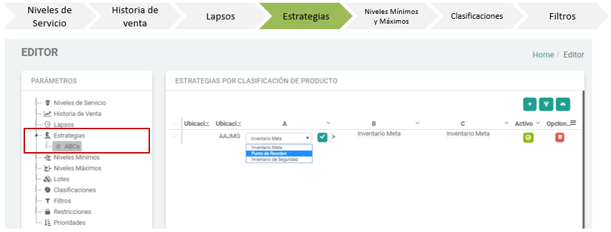 - En la pantalla de Estrategias se muestran los diferentes parámetros que determinan cuando serán resurtidos los productos de las diferentes clasificaciones.