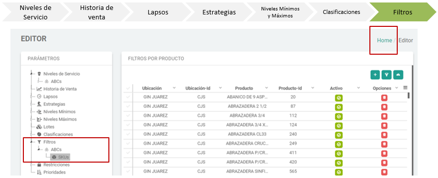 - El parámetro de Filtros asigna que SKU pertenece a cada sucursal. Se muestra cada SKU con su correspondiente descripción y sucursal.