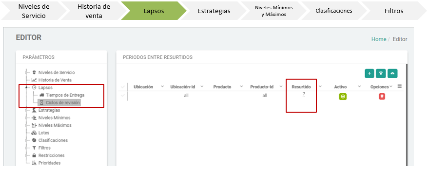 - En Ciclos de Revisión, se selecciona la frecuencia en la que las sucursales serán resurtidas. En este caso se estableció un resurtido de cada 7 días, o en otras palabras, una vez por semana.