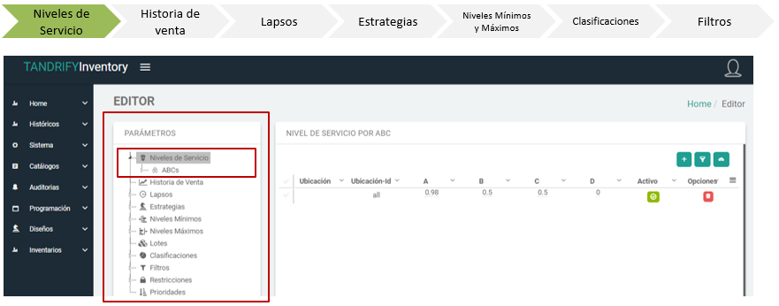 - Niveles de Servicio es el primer parámetro y se muestra por default al entrar al editor.