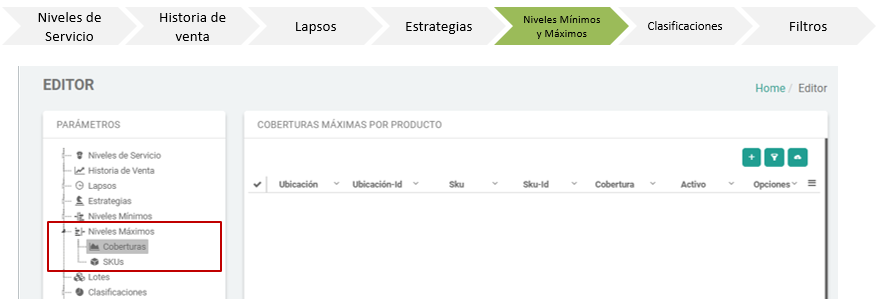 - Los Niveles Máximos de cada producto se identifican con dos parámetros diferentes; coberturas en días o unidades de cada SKU.