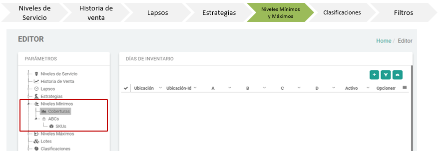 - Los Niveles Mínimos de cada producto se determinan con tres parámetros diferentes; coberturas en días, por clasificación o de cada producto.